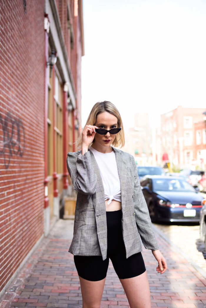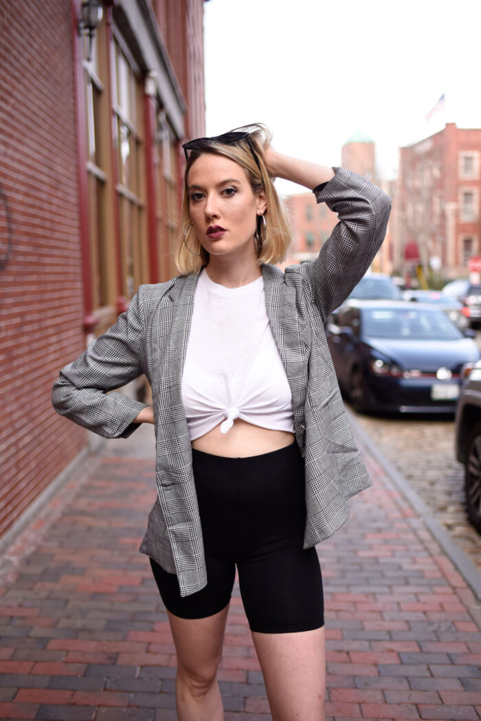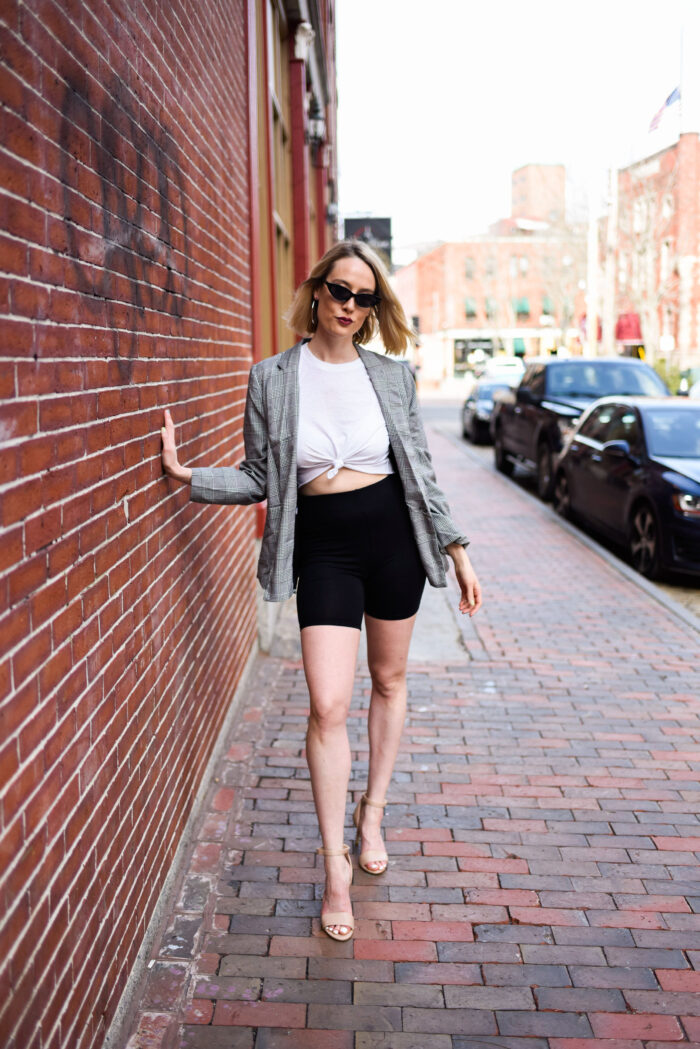 Style Tip: Show a little skin by styling your super-high-waisted bike shorts with a white cropped top. Add a structured blazer on top to play the juxtaposition of tailoring and sportswear.
