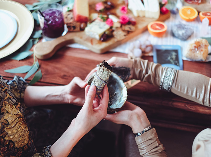- Sage wands (also called smudge sticks), oils, or Palo Santo wood to burn and “clear” the energy