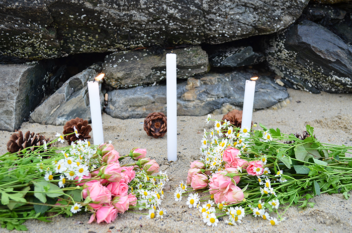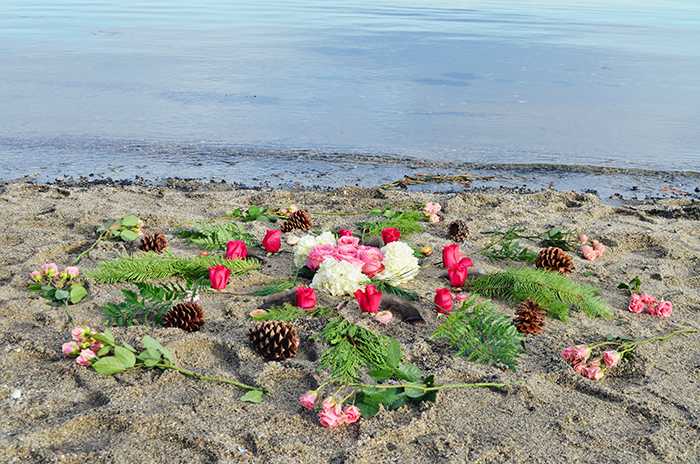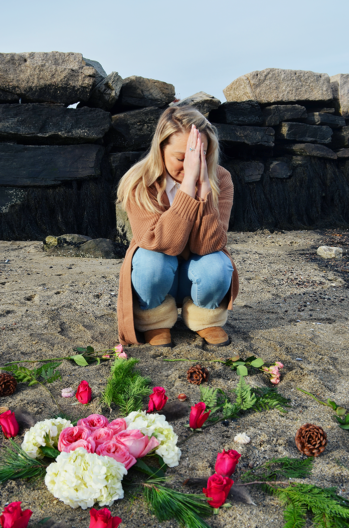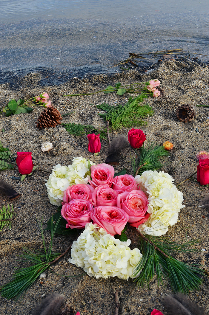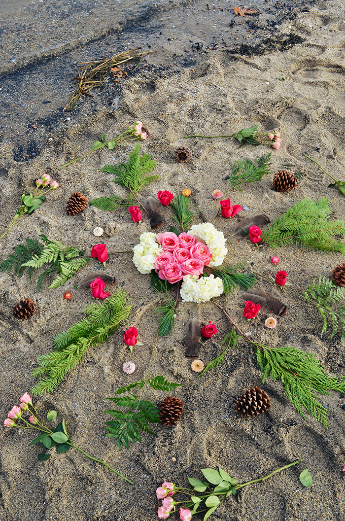 The mandala helps us to honor the earth, all its beauty, and the interconnectedness of all. Begin by looking for anything that would work to create a beautiful circle. Find items in nature like flowers, seashells, crystals, pinecones, rocks, feathers, twigs, etc. Start with a center… And build outward. Or create a container, and fill inward. Allow yourself to use your own creative and inspired knowing to create a perfect masterpiece. There is no “right” way to make a mandala. For us, we started with the center using beautiful big pink roses to symbolize self-love as a priority and incorporated wintery elements like pine and dried flowers to contrast life and death.
